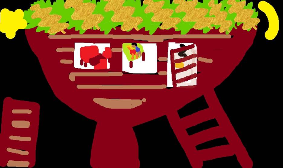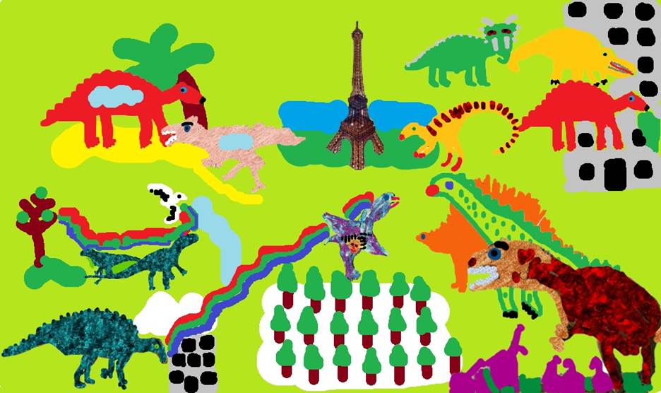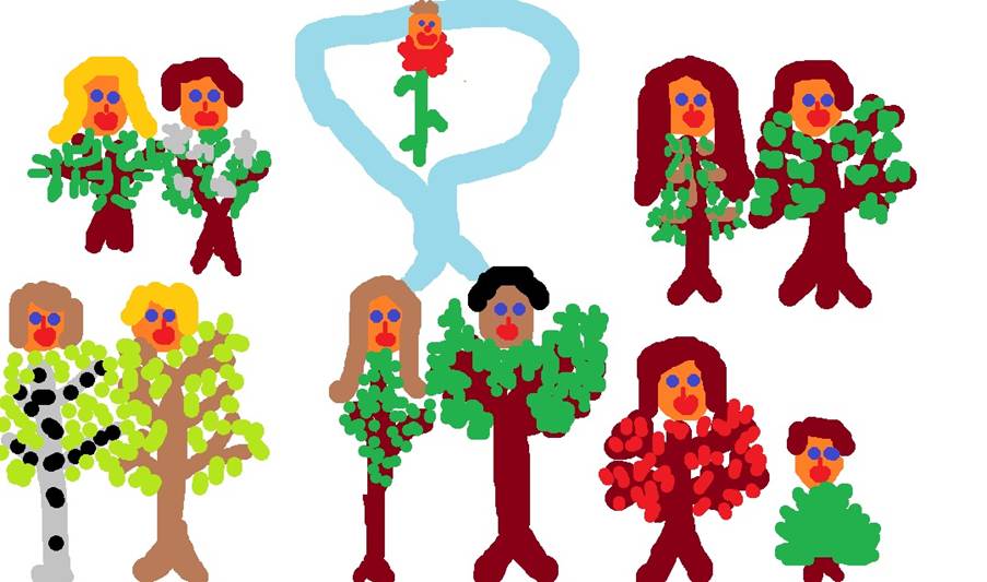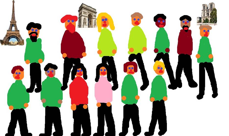Danièle’s family tree, by Odile and Zamir, from top left to bottom right, comrades Monique, Anton, Yvonne, Misha, Jean-Luc, Marius, Danièle, Olivier, Odile, and Little Jean-Michel, and up in the cloud, Danièle and Olivier’s baby to come, Flore