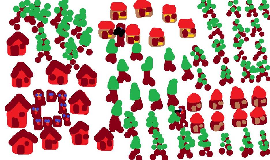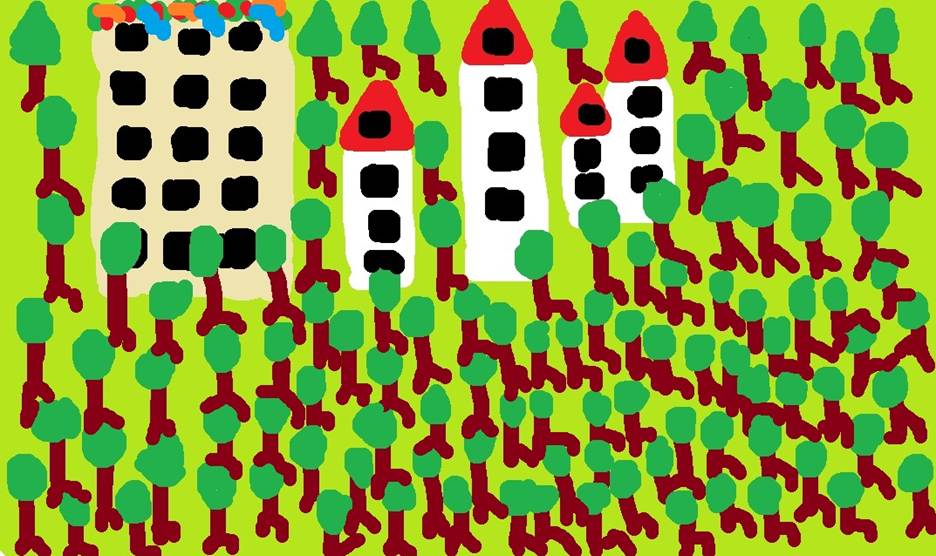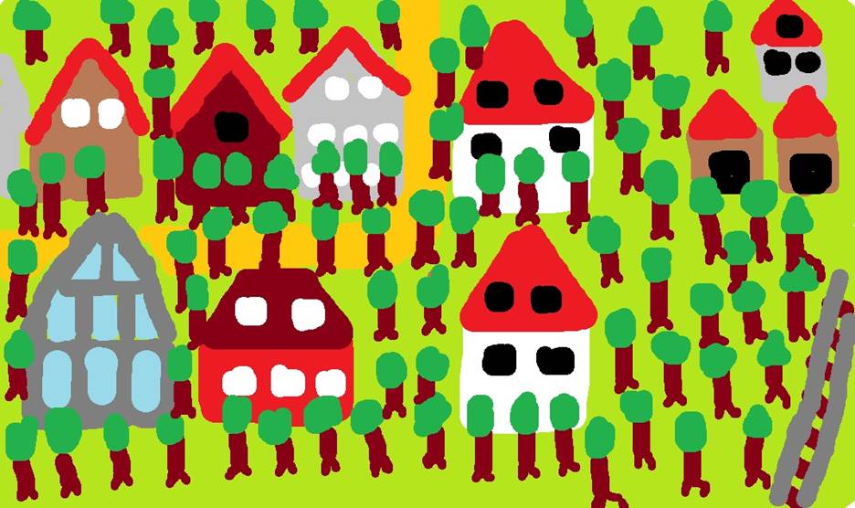 “Therefore, we can now focus on returning to the forest and start with the basic entity of our lives now, the village. In the future, it will have to fit on a meadow by or even in a forest, with just twenty to a couple dozen houses like Illyria, the garden colony, and the manouche camp taken together, 150 residents maximum, but no larger than that. The agglo(-meration) of Aimeran which these days consists of three villages: Aimeran Nord, Ouest, and Sud, each with about 600 inhabitants would have to de-construct and disperse its houses much further.