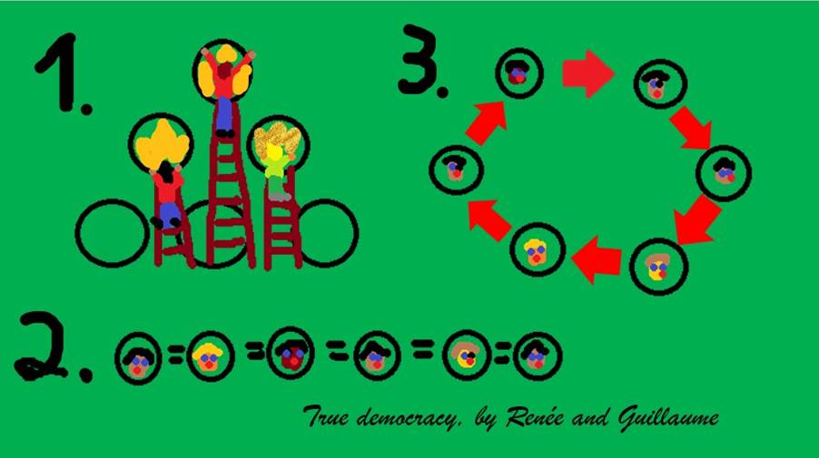4) We have to succeed in eliminating the central government as well as all governmental hierarchies down to the town and village level, all police, army, and secret services, as well as all corporate hierarchies and their security forces immediately at the outset of the revolution, so as to prevent a constantly renewing flow of mercenary armies. Instead, only brigades, neighbourhood assemblies of at most seven members with the chairman rotating daily or at least every week, workplace and village plenary assemblies with the moderators rotating every hour, shall take all decisions consensually. All assemblies shall be on an equal level, none of them entitled to overrule the others, and all decisions, including local, regional, continental, and world-wide referendums shall be liable to instant revocation if even a single neighbourhood, workplace or village assembly raises additional consideration and relaunches the discussion.”