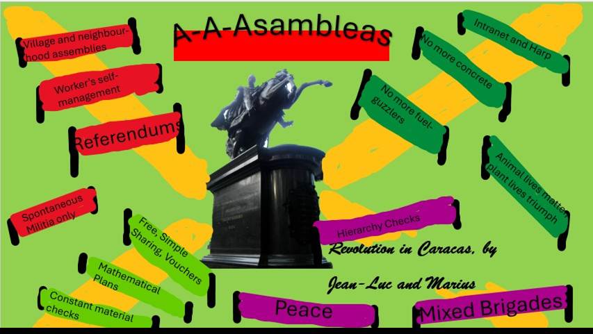 reaction by force of arms but mainly by persuasion, convincing the public and private security forces that their future and that of their children is with the revolution. Yet we have to eliminate all money and money substitutes such as crypto and tokens and get as quickly as possible to an organisation with free allocation and distribution of inputs, tools and equipment, food and all basic and other goods at markets, share points, get them directly from the producing workshops, simply share them, engage in revolutionary barter, or get help by the neighbourhood assembly when needed.