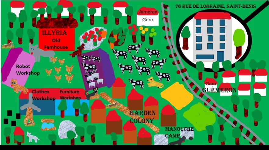 Map and Plan of our rural cooperative Illyria, Yvelines, and our neighbourhood assemblies Casa Latina Russki Dom Peace Dove on 76 rue de Lorraine, Saint-Denis, State May-June of Year 19 of the Revolution during comrade Miguel’s “Gangster, Guerrillero, Revolutionary”, there are 17 three-room apartments with the bedrooms occupied as follows, Young Revolutionaries marked in italics: